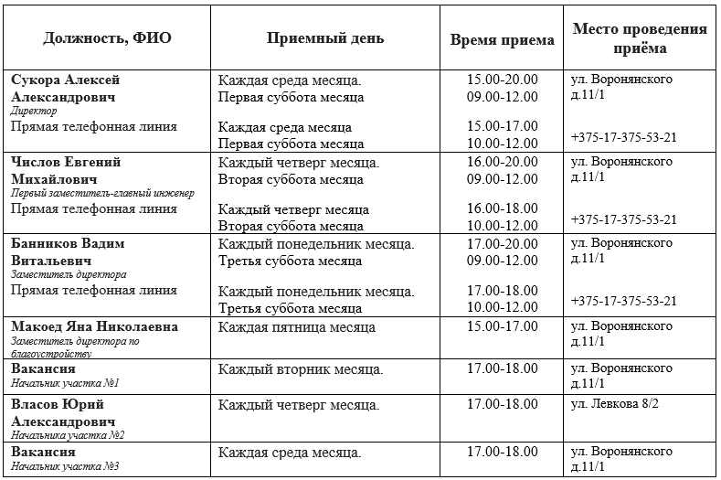 Структура График личного приема граждан От admin - 12.07.2022 0 1251 FacebookTwitterPinterestWhatsApp ГРАФИК личного приема граждан руководящим составом ГП «Жилищно-эксплуатационный участок №1 Октябрьского района г.Минска»